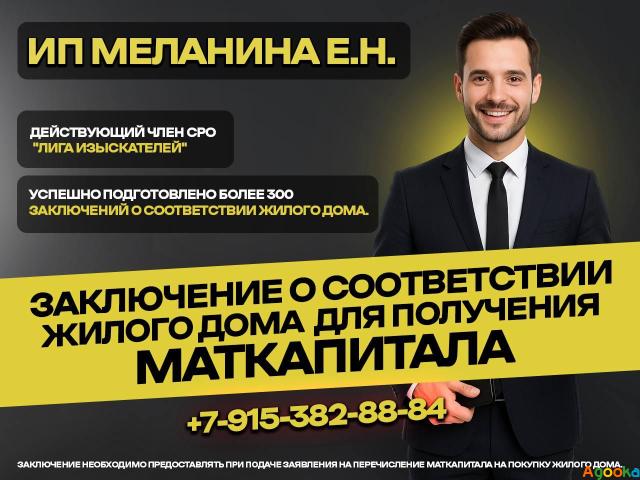 "Подготовка заключения о соответствии жилого помещения, являющегося жилым домом (частью жилого дома), в том числе домом блокированной застройки, требованиям, предъявляемым к жилому помещению, и его пригодности для проживания.С 1 января 2025 к заявлению на распоряжение материнским капиталом на покупку дома, его части или таунхауса нужно приложить заключение о его соответствии требованиям, предъявляемым к жилому помещению, и пригодности для проживания - это требование внес Федеральный закон “495-ФЗ от 26.12.2024 г.